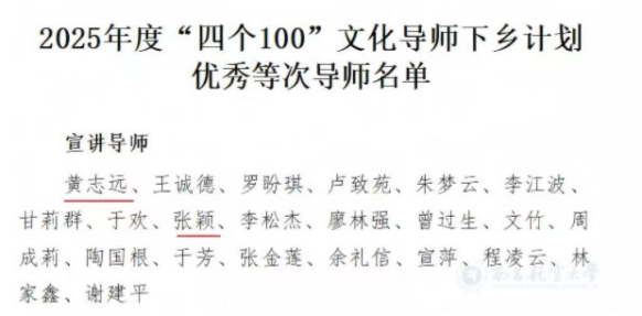 近日,中共江西省委宣传部发布《关于评定2025年度“四个100”文化导师下乡计划优秀等次导师和优秀项目的通报》,瓦力游戏 黄志远、张颖两名宣讲导师获评2025年度“四个100”文化导师下乡计划优秀等次导师。